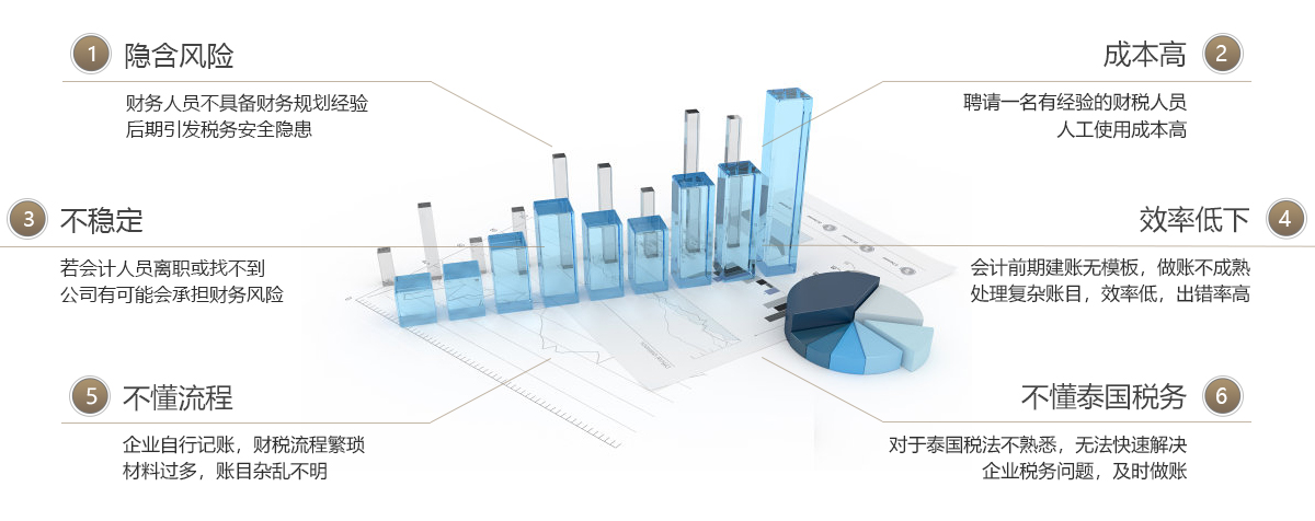 高效理清账务 High efficiency — | 我们能为在泰经营发展的合资/外资企业控制成本以及优化工作效能,您可放心委托我们进行会计核算、记账、报税、审计等一系列事务。使账目清晰,消除公司糊涂账,提前杜绝隐患。 | |